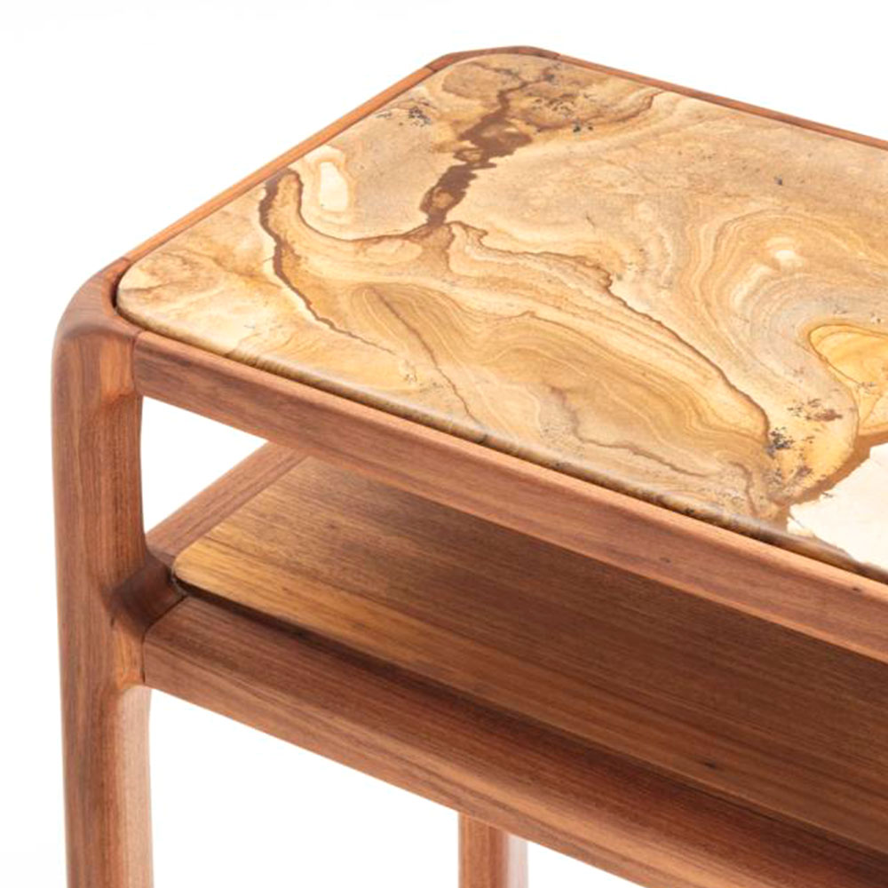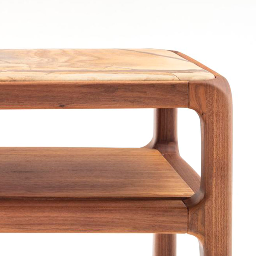 Pés e estrutura em madeira maciça certificada. Com processos de usinagem que garante a durabilidade do mobiliário. Disponível em freijó natural ou acabamentos tingidos. Tampo em MDF laminado, pintado ou em pedra.