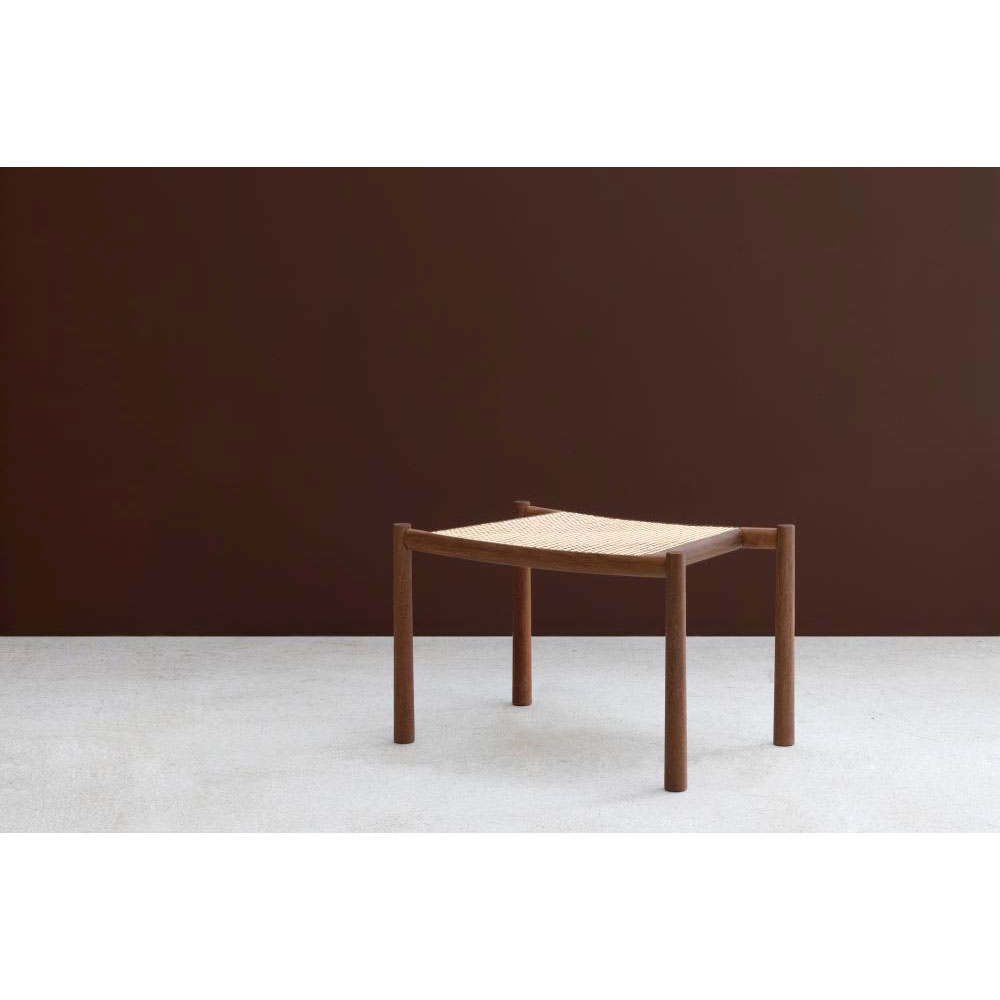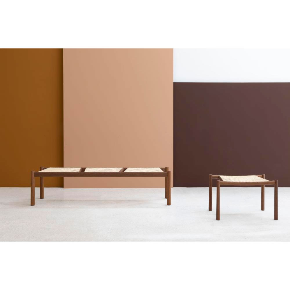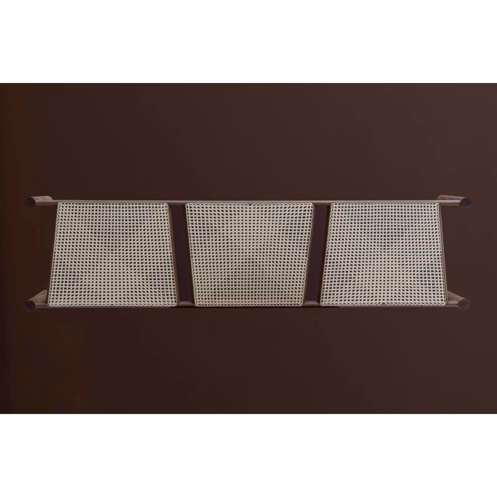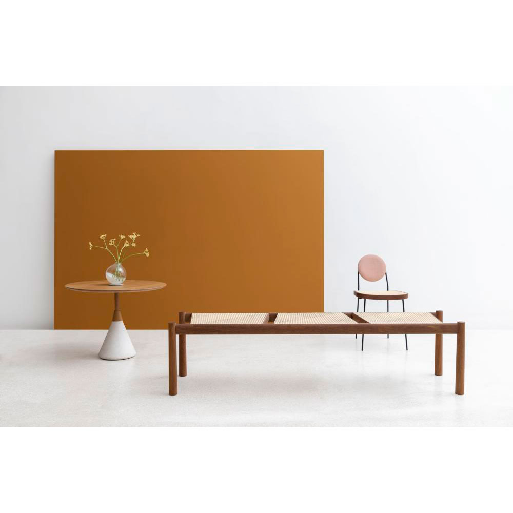 O desenho une de forma sutil dados geométricos – os pés cônicos – e traços de natureza mais orgânica, como as curvas e travessas ovaladas. Os quadros que recebem a palha remetem aos ideogramas japoneses e à cultura indígena.
