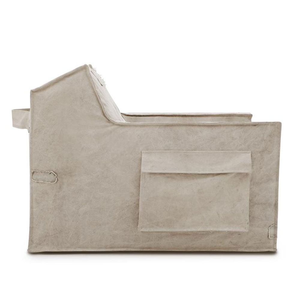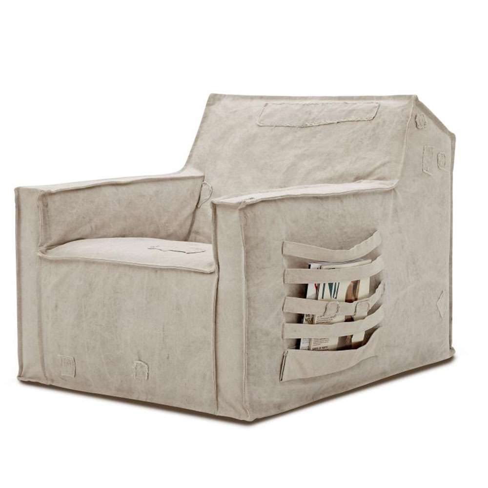 Por trás desse desenho relativamente simples, se esconde uma estrutura macia, e ergonomicamente muito confortável e funcional. Seus rodízios embutidos, somam-se a capa com bolsos e porta-revistas e livros nas laterais da poltrona, a alça na parte posterior do produto, foi pensado para movimentar a peça mais facilmente.