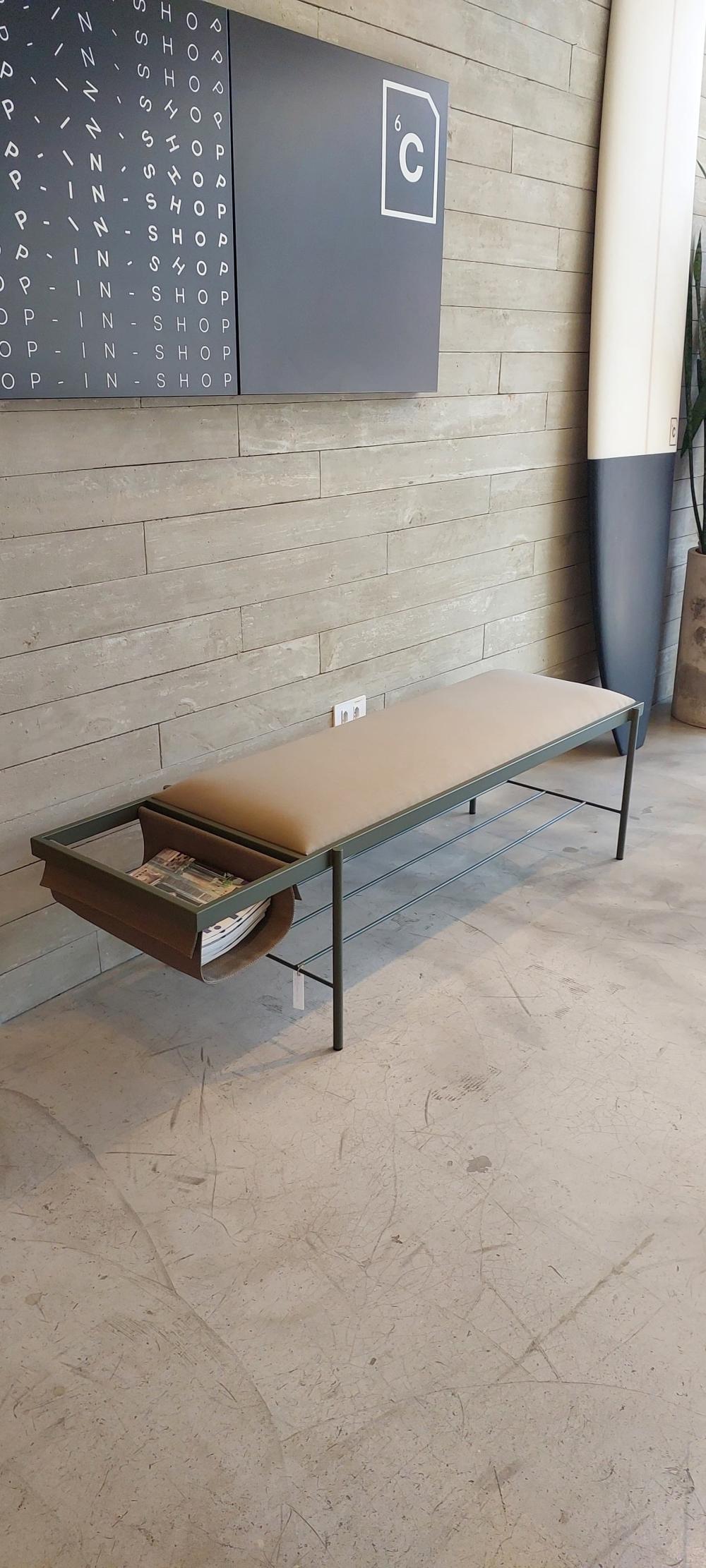 Base em aço carbono com pintura eletrostática, assento estofado, revisteiro em couro.