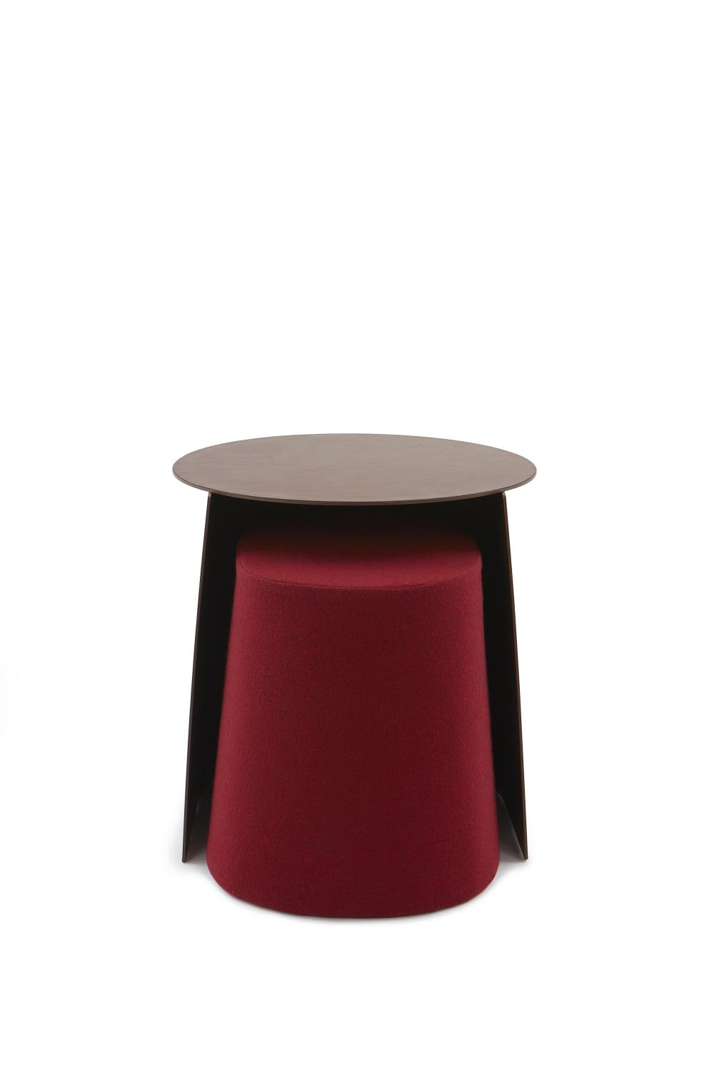 C451 são mesas laterais encaixáveis, podendo ser utilizadas uma no interior da outra ou recebendo o pufe C351 quando esse estiver sem uso. Seu desenho equilibra a sensação de leveza criada pelas espessuras mínimas, como duas folhas apoiadas, com a resistência da chapa de aço. Esse contraste cria uma peça imponente, que permite seu uso combinado ou solitário de forma discreta e elegante.