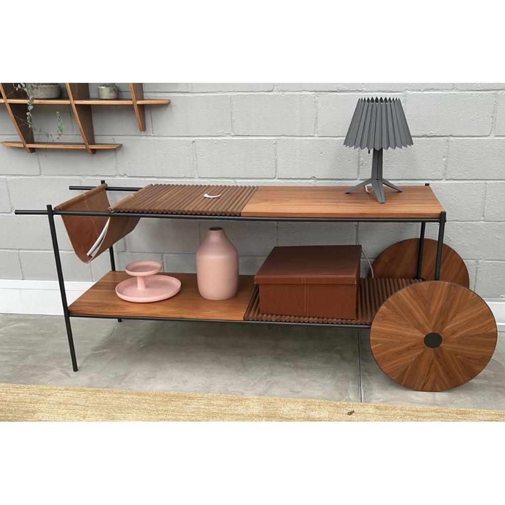 Carrinho em lâmina de madeira natural, com estrutura em aço carbono pintura preto.