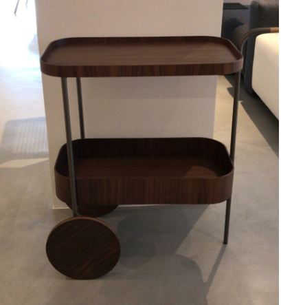 Carrinho em lâmina de madeira natural, com estrutura em aço carbono em pintura chumbo, com detalhe dourado.