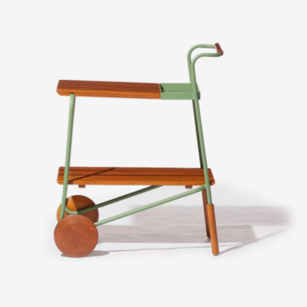 Estrutura em alumínio, tampos e detalhes em madeira.
