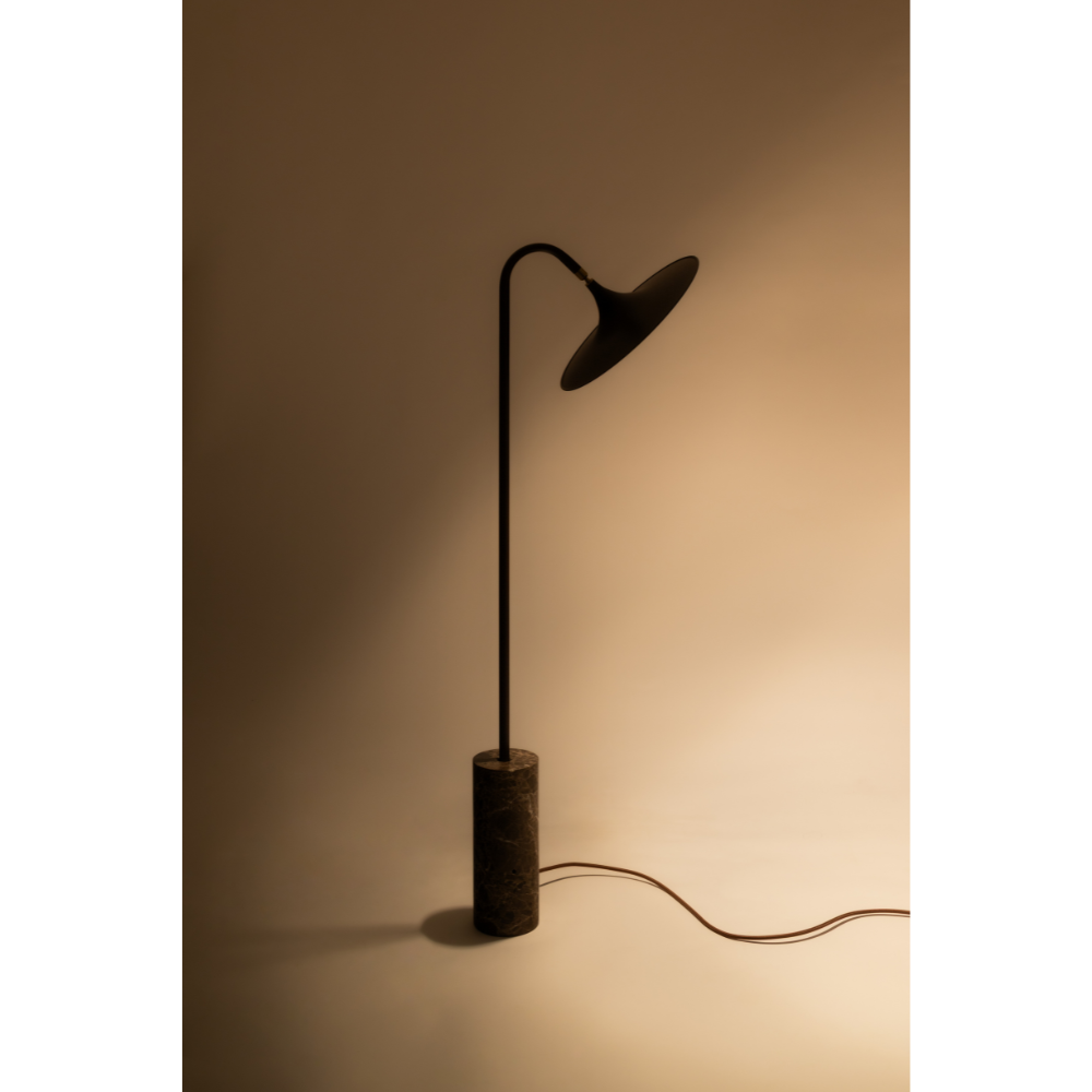 alumínio repuxado ou mármore, sustentando o tubo metálico e a cúpula orientável. ilumina de forma indireta e suave, com altura ajustável e acionamento por toque. funciona como ponto de luz e estrutura no espaço.