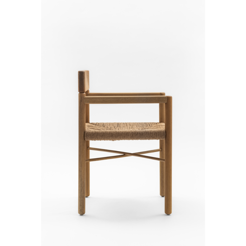 helô tem desenho esguio em madeira maciça e assento tramado em corda ou couro. a estrutura é leve, firme, com ergonomia precisa. o trançado adiciona textura e memória, equilibrando matéria, conforto e gesto manual.