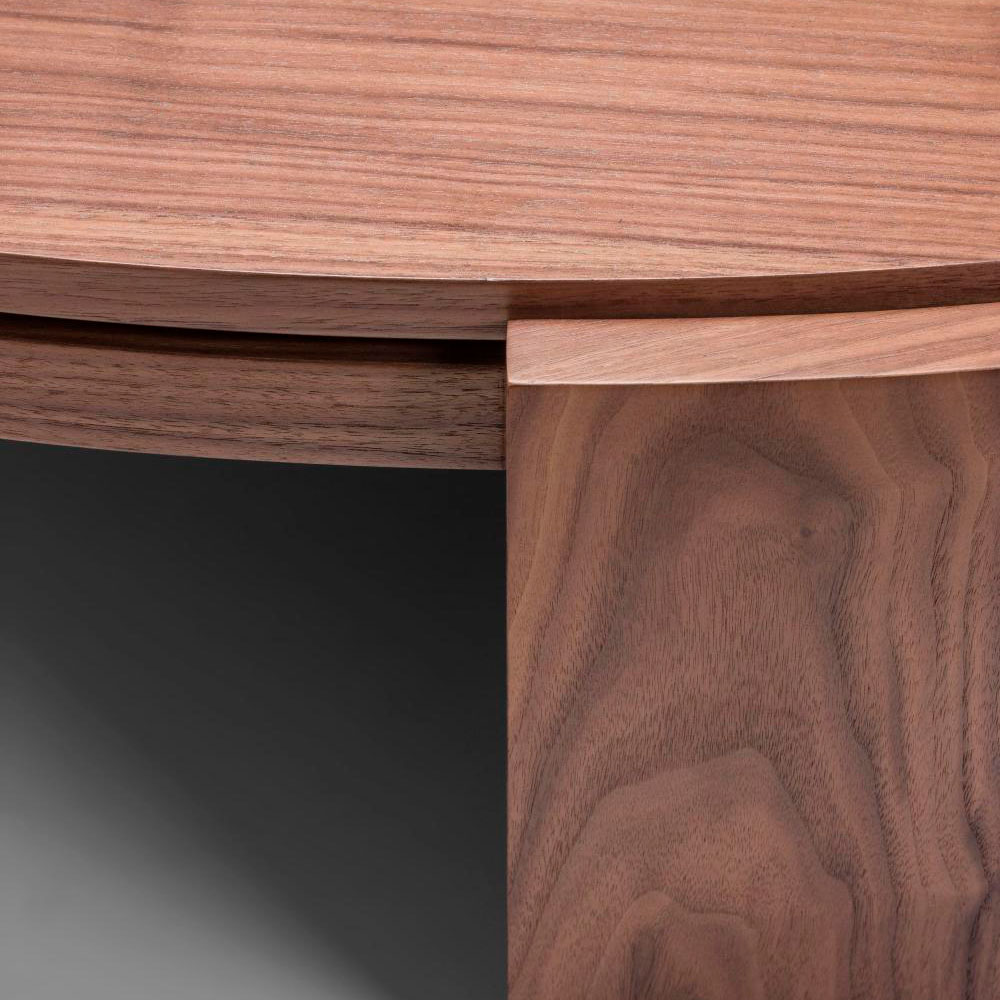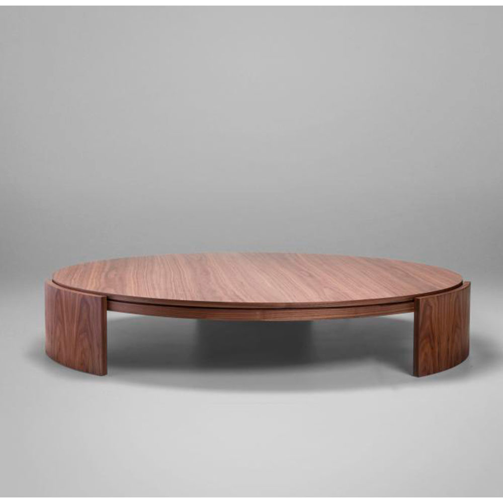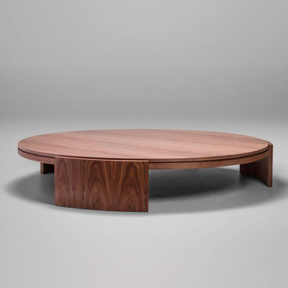 De formato robusto, a Clock central se apresenta de forma imponente ao ambiente. A tríade de pés em lâmina natural complementa de maneira harmoniosa seu grande tampo redondo, que parece flutuar sobre a estrutura.