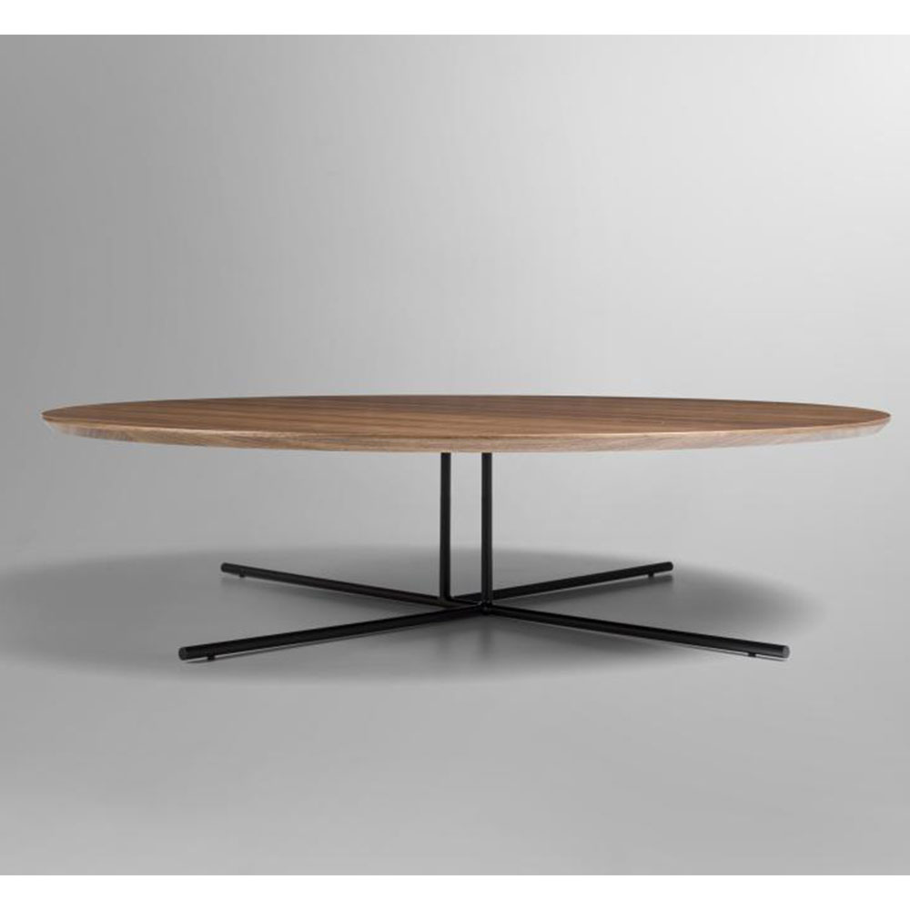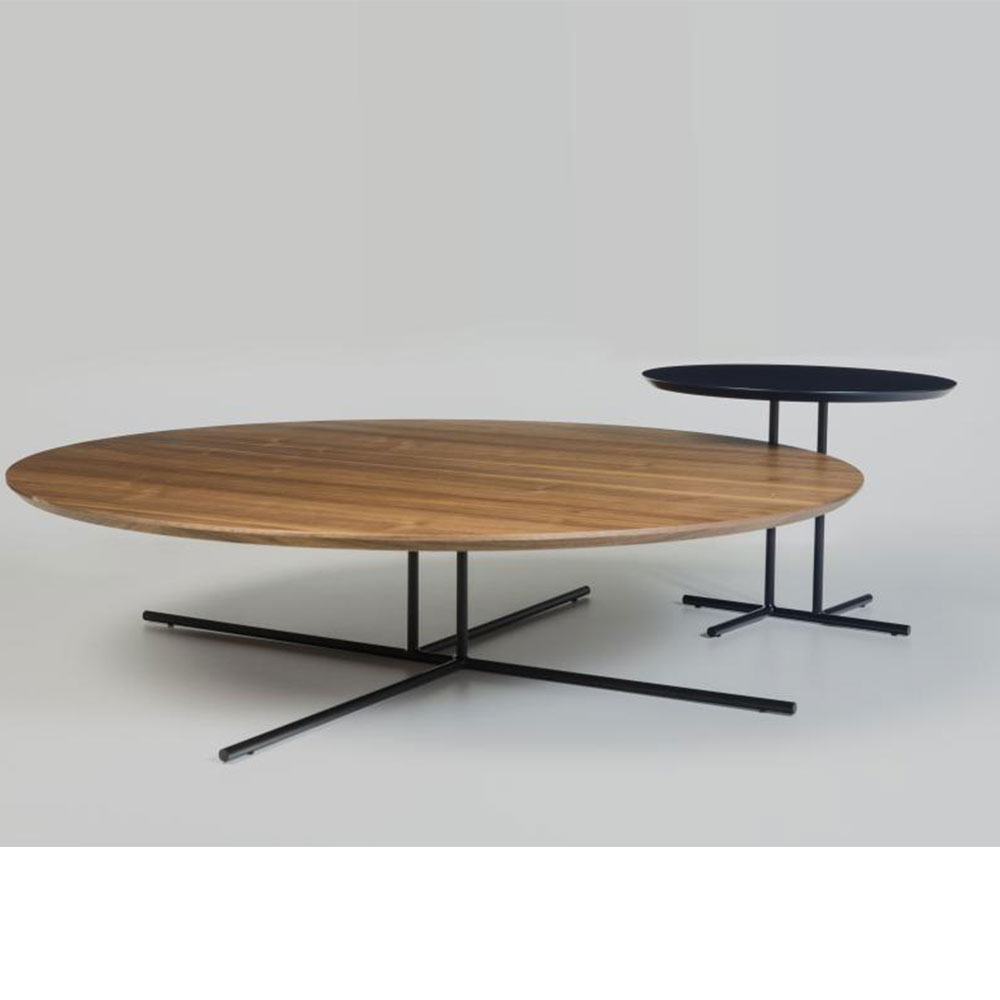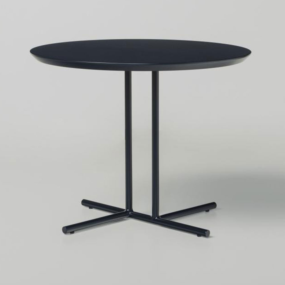Os pés tubulares cruzados, são umas das características da família de Mesas Cross. Aqui os tubos cruzados na base garantem a estabilidade e apoio necessário para as duas hastes que sustentam o tampo. A suavidade das linhas é acentuada pelo acabamento chanfrado dos tampos de madeira laminada.