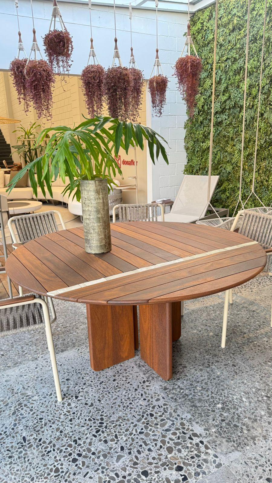 Estrutura em madeira, tampo em madeira. Detalhe do tampo em cerâmica.
