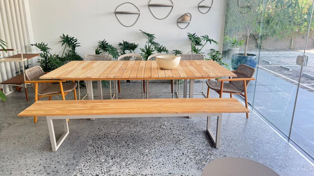 Mesa de jantar com tampo ripado em madeira Deca