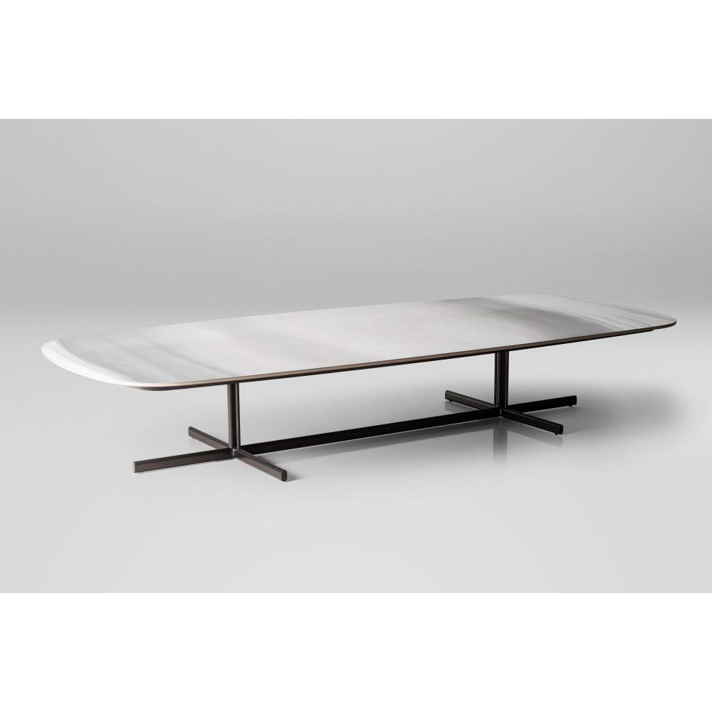 A base em forma de cruz é uma das características predominantes no design das mesas da família Morisson; além de proporcionar leveza e equilíbrio à mesa os pés em metal são um destaque para a Mesa de centro Morrisson, possui tampo com recorte em forma de barril. Uma peça versátil que traz para o ambiente a textura da pedra, aliado à um acabamento que valoriza ao máximo o material.
