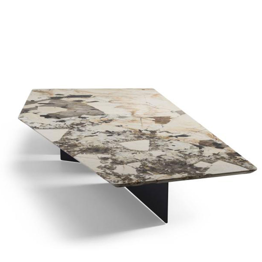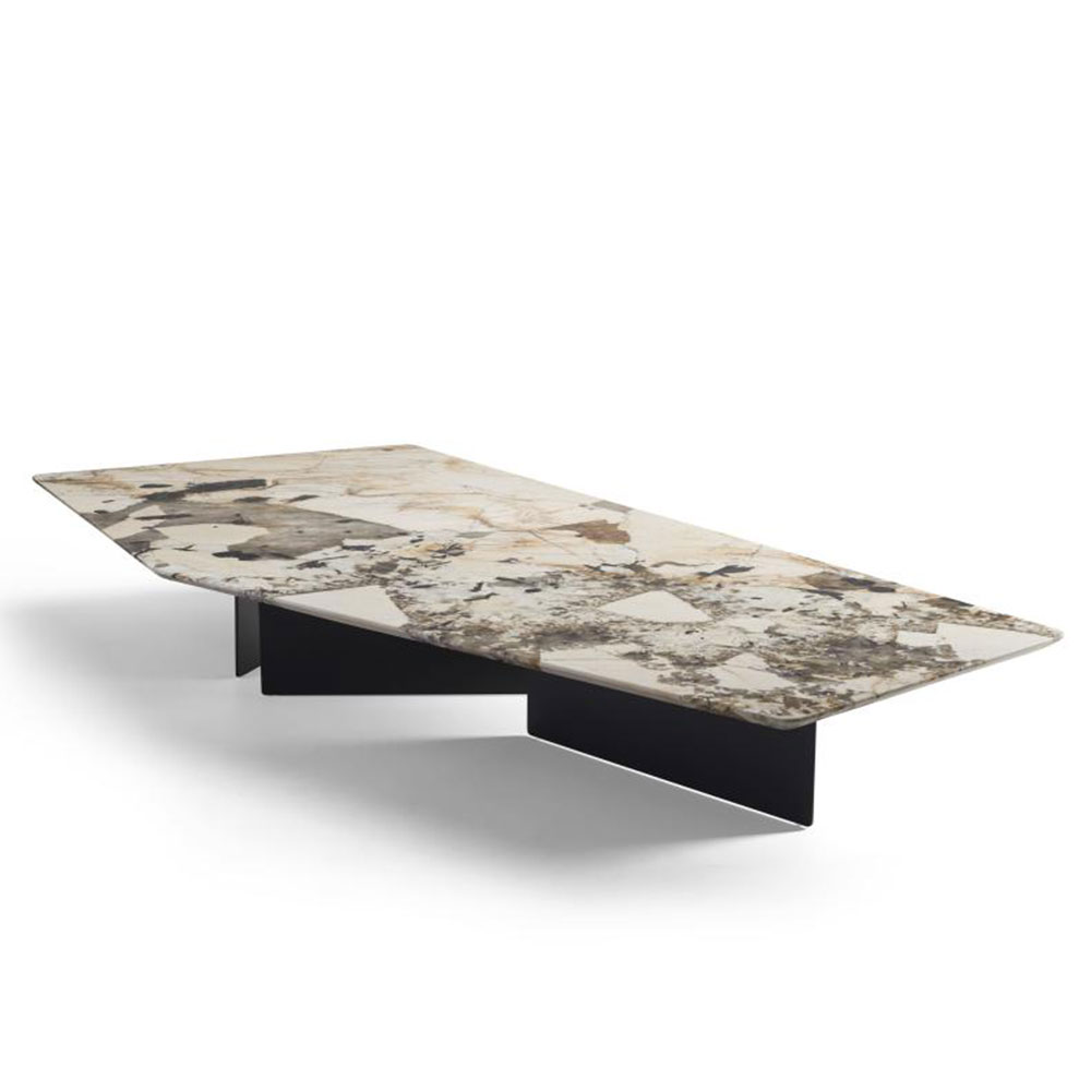 A mesa de centro Pier nos remete a uma obra de arte. É uma peça icônica que traduz um design arrojado. Seus pés em chapa de metal posicionados de formas diferentes, contrastam com seu tampo de formato irregular, podendo este ser produzido em mármore ou lâmina.