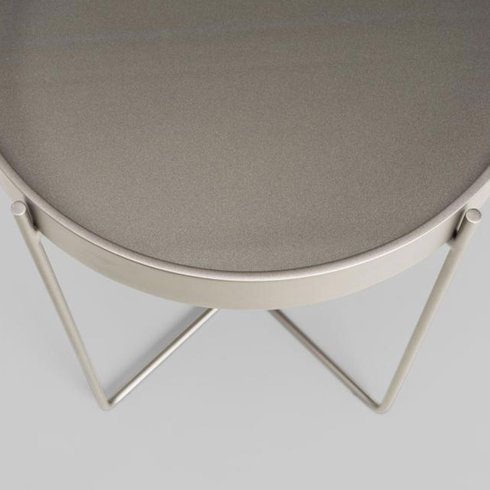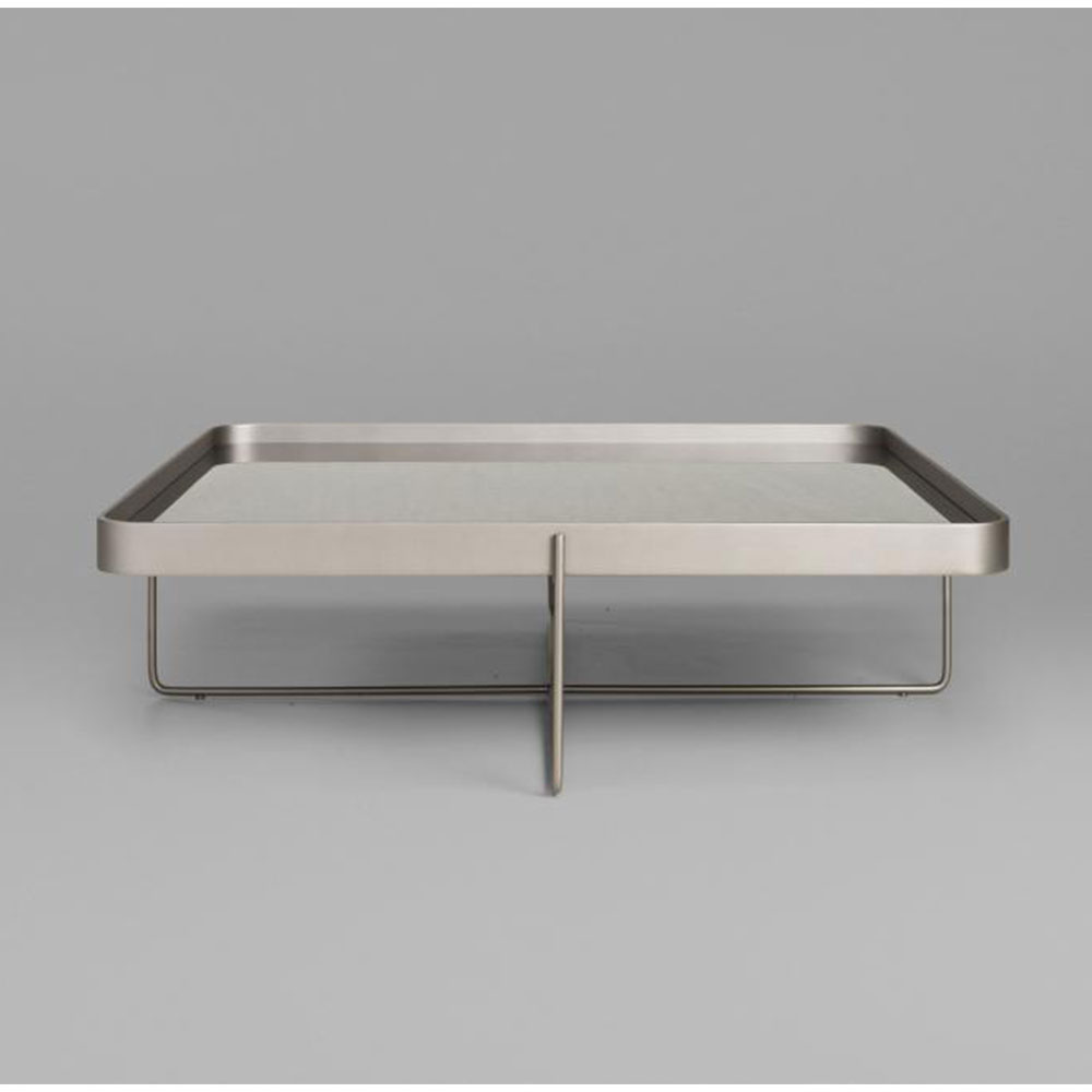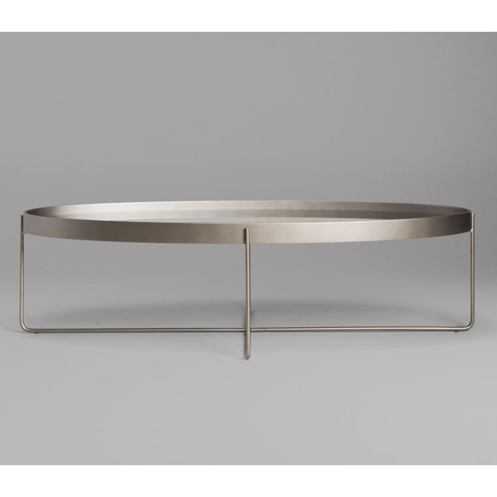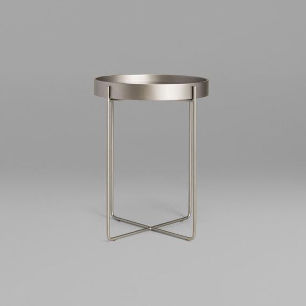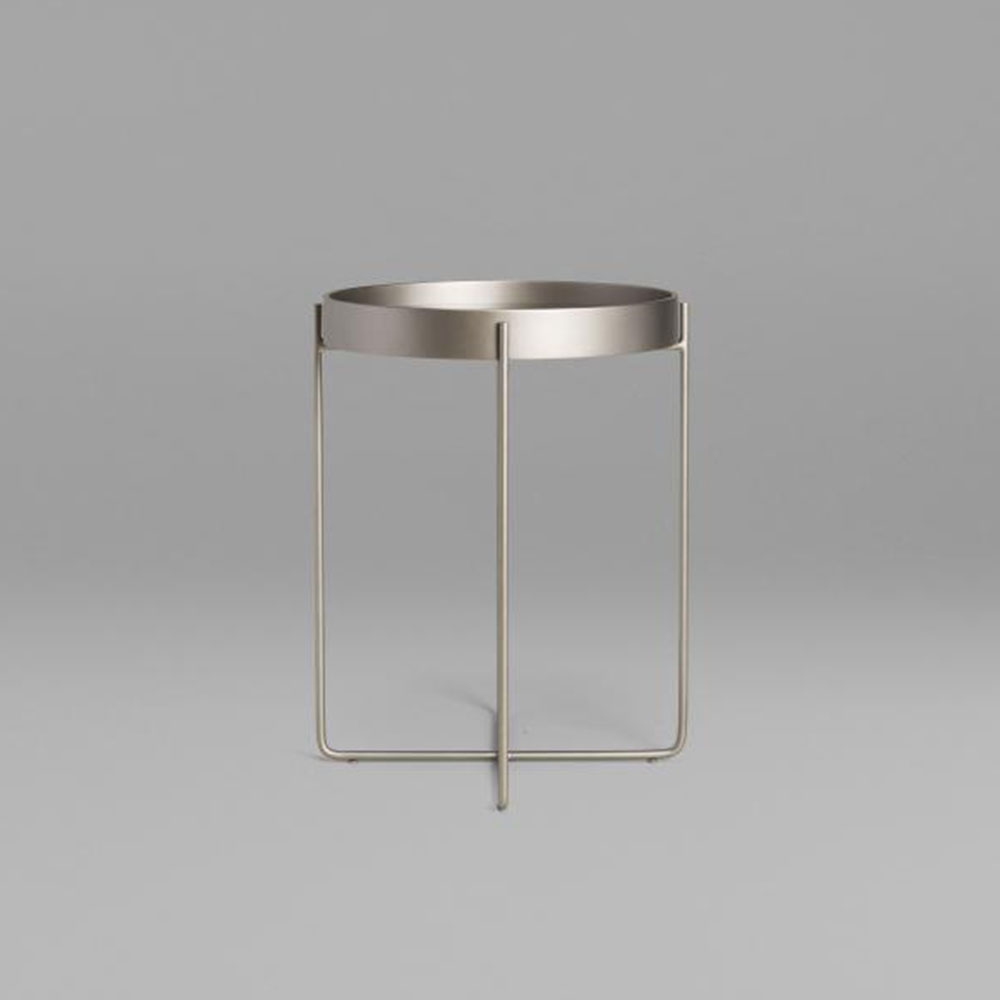 A mesa Tubos recebe esse nome tanto pela estrutura cilíndrica que compõe a base, quanto do tampo, que também sugere uma seção tubular. A estrutura metálica com base sobreposta em cruz tem as extremidades superiores alongadas para receber o tampo em madeira laminada. As bordas do tampo conferem um detalhe especial para essa mesa.