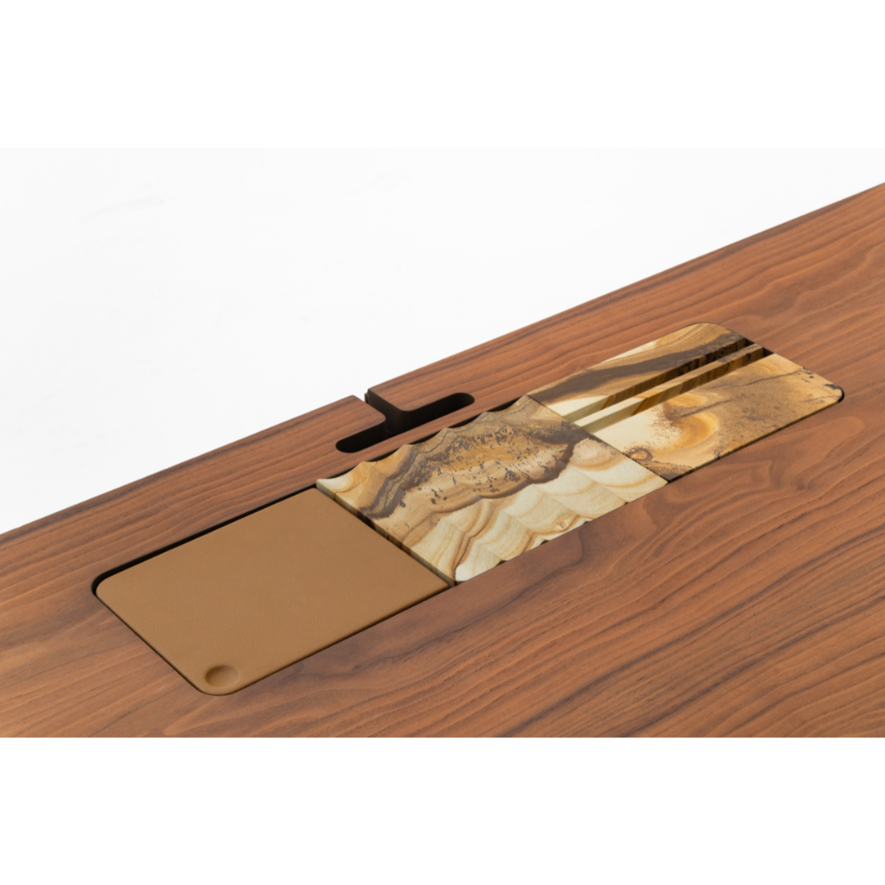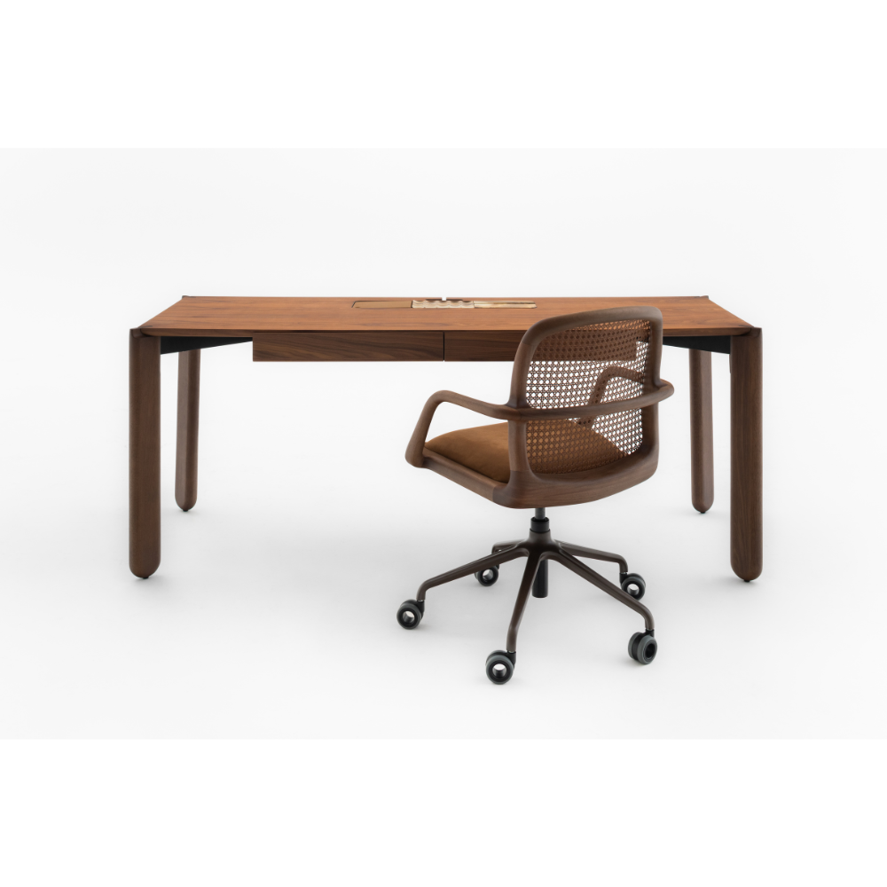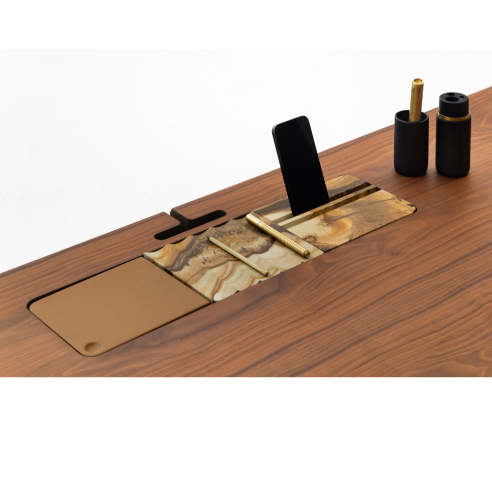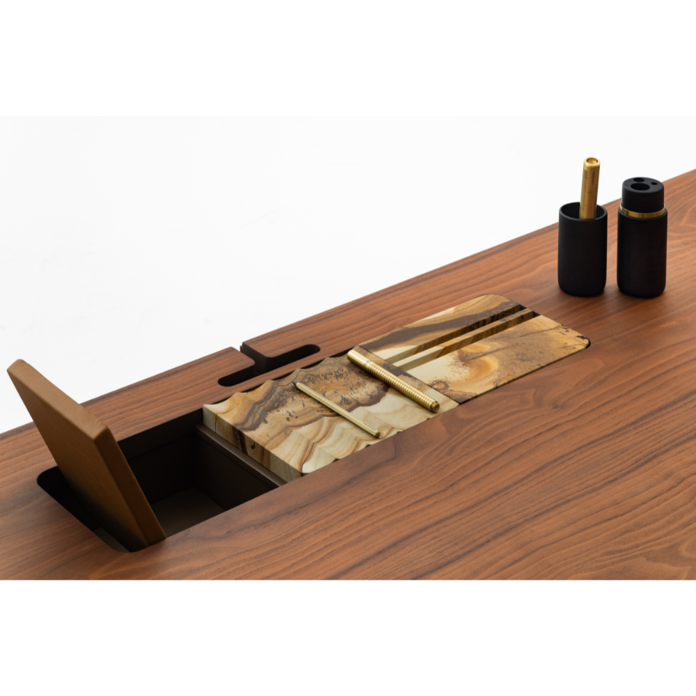 escrivaninha Olivia tem estrutura que combina a densidade da madeira maciça ao rigor do aço, em linhas contidas que sustentam o uso. o tampo, em laminado natural ou tingido, acomoda pequenos objetos do dia a dia em uma escotilha de couro. organizadores integrados recebem lápis, papéis e canetas, com apoio em mármore usinado para celular ou tablet. nas laterais, aberturas precisas ocultam fios e fontes, função resolvida com desenho limpo.