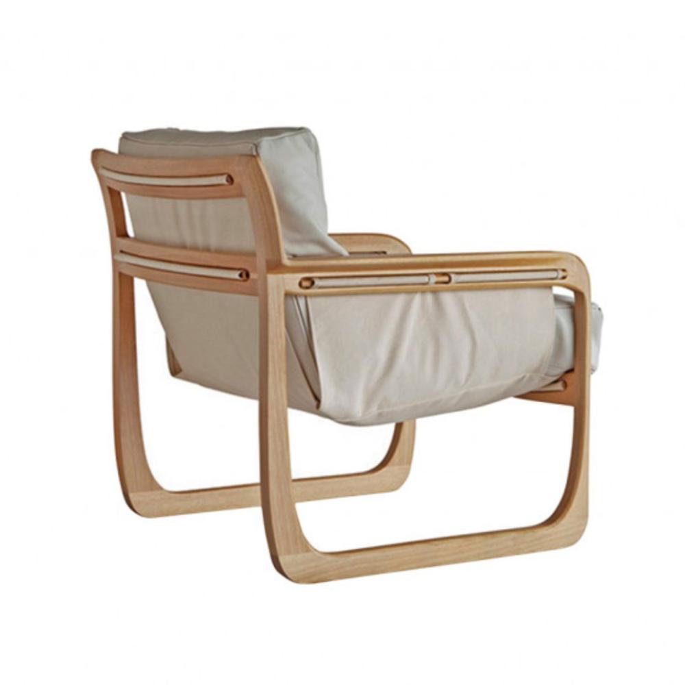 Poltrona em madeira maciça com assento e encosto estofados e estrutura em lona. MEDIDAS: