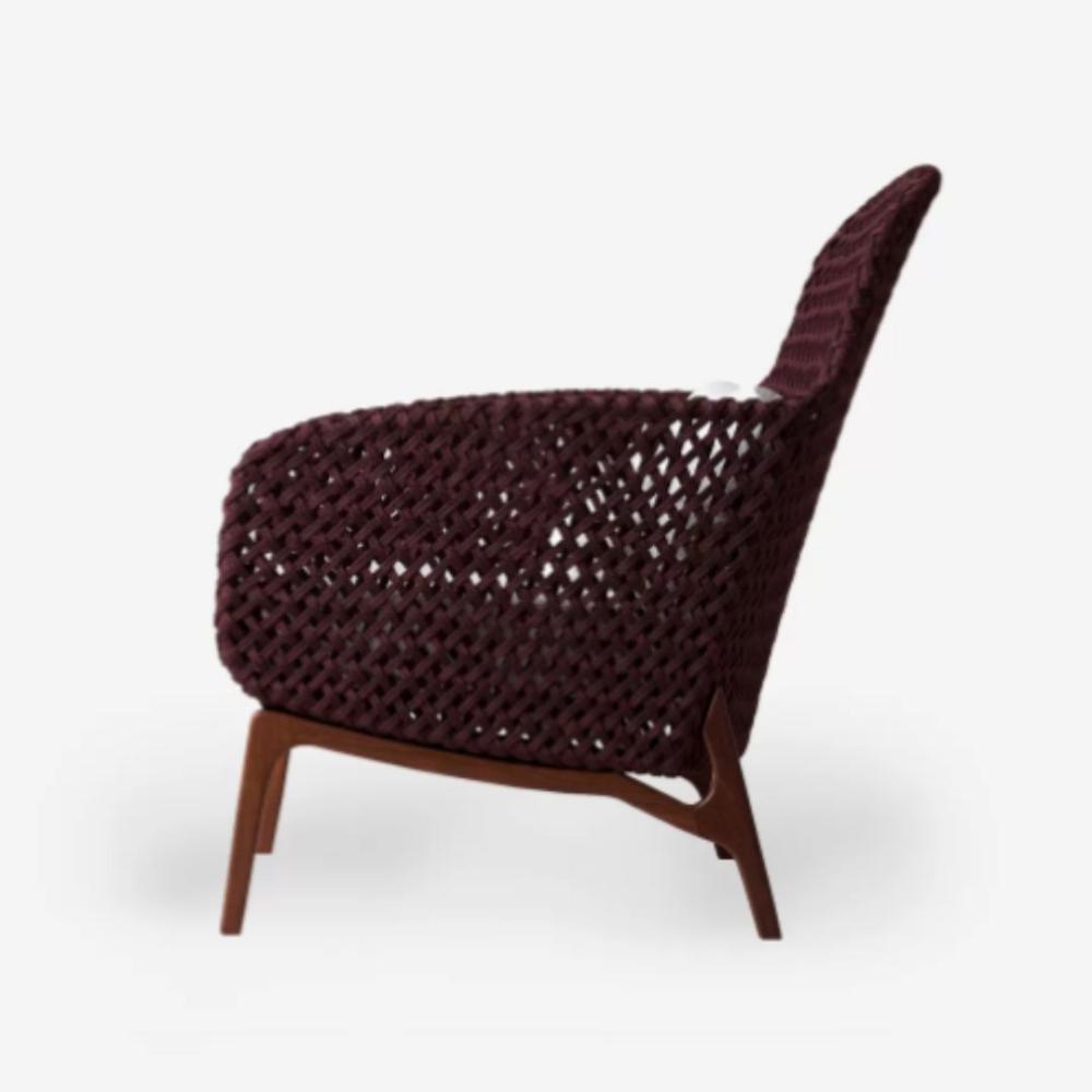 Estrutura em alumínio e madeira, assento almofadado, encosto em corda náutica. Acompanha: 1 almofada para encosto M e 1 almofada decorativa P.
