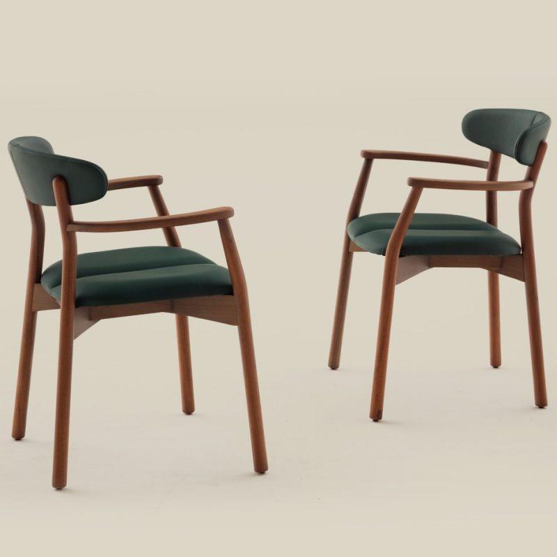 Cadeira em madeira de jequitibá e concha anatômica. Opção de encosto estofado ou em madeira laminada.