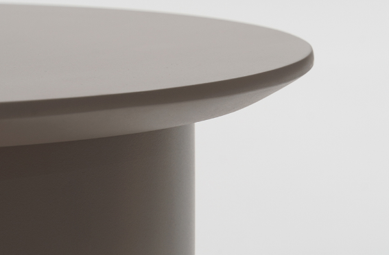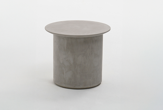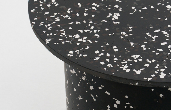 mesa lateral round com acabamento em granilite preto ou cimento.
