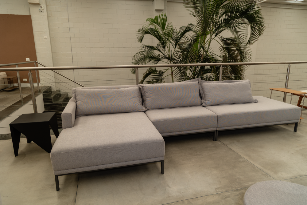 Sofá 01 braço com chaise, estofado em linho cinza.